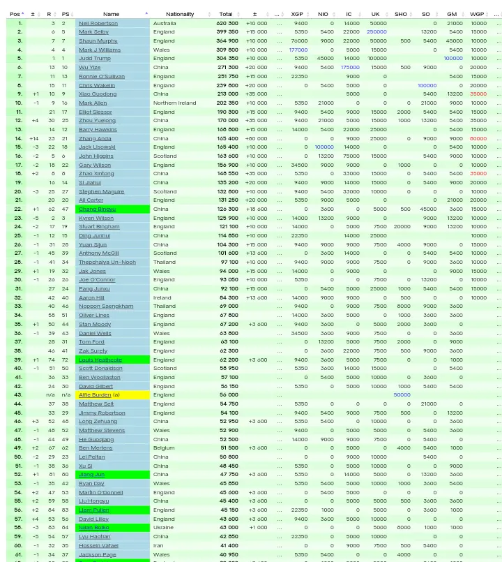 本站32强有5位00后均来自中国且都晋级16强,而外协只有一位却遭遇一轮游!放眼巡回赛,中国已经出现四位00后排名赛冠军,虽然其中一位遭遇禁赛,但余下三者势头强劲,新科国锦赛冠军吴宜泽是目前唯一三次晋级排名赛决赛的00后!上赛季苏格兰公开赛冠军雷佩凡在重返职业第一年就打破生涯排名赛冠军荒,也是00后独一份!至于早早夺得欧洲大师赛冠军的范争一,虽然在那之后再也没有打进排名赛半决赛,却是第一位打出单杆147的00后,绝对是一位“天选之子”,迟早会王者归来,毕竟他在决赛击败了历史最佳。反观外协,目前还没有一位选手晋级半决赛,表现最好的是墨菲“门徒”穆迪,本赛季打进两站八强。